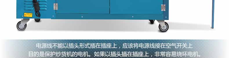電源線不能以插頭形式插在插座上,應(yīng)該將電源線接在空氣開關(guān)上,目的是保護(hù)炒貨機(jī)的電機(jī)。如果以插頭插在插座上,非常容易燒壞電機(jī)。