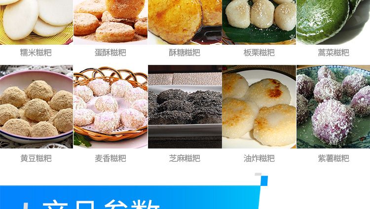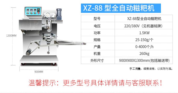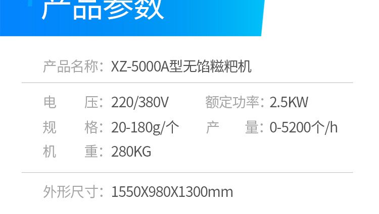 名稱XZ-5000A型無餡糍粑機(jī) 電源220/380V(見機(jī)器名牌) 功率2.5kw 產(chǎn)量0-5200個/小時 尺寸 1550×980×1300mm 重量280kg 規(guī)格20-180克/個 其他