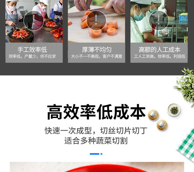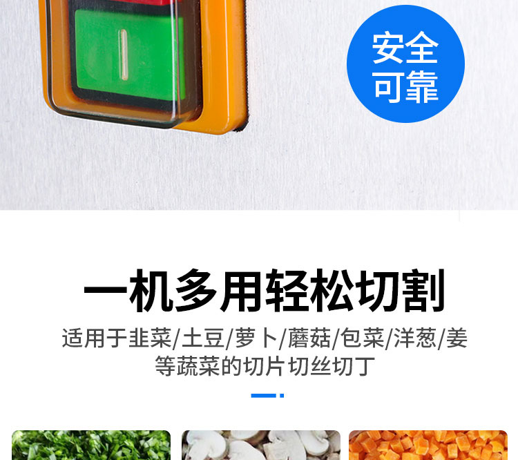 用于硬、軟各種根、莖、葉類蔬菜和海帶的加工,可切制片、塊、絲、丁、菱形、曲線形多種花樣。