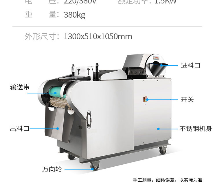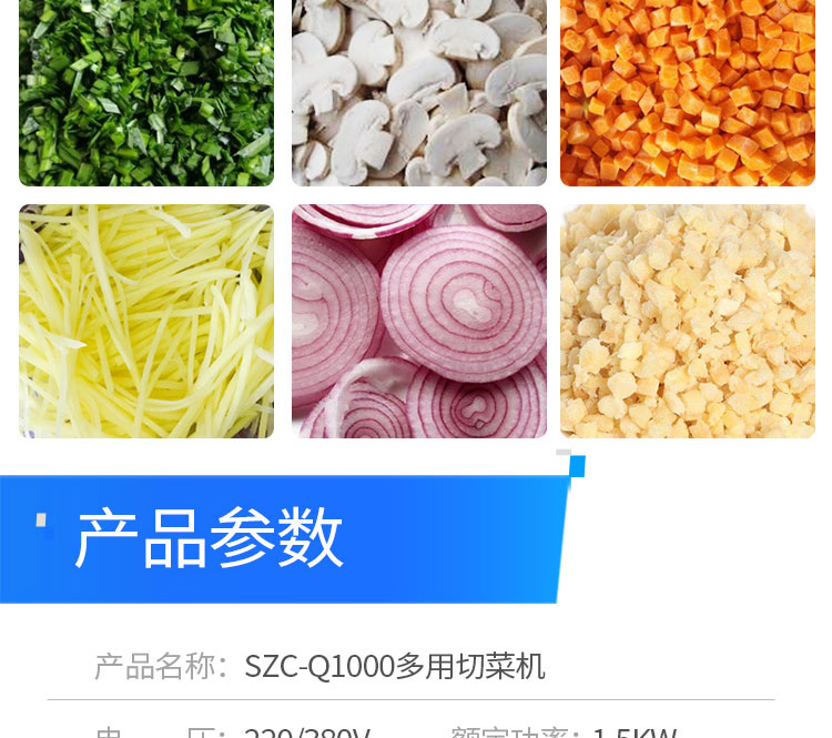 名稱SZC-QJ660/Q1000小型多功能切菜機 電源220/380V(見機器銘牌) 功率1.5kw 產(chǎn)量200-1000千克/小時 尺寸1300*510*1050mm 重量380kg 規(guī)格 其他