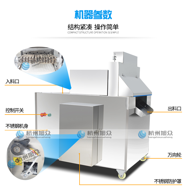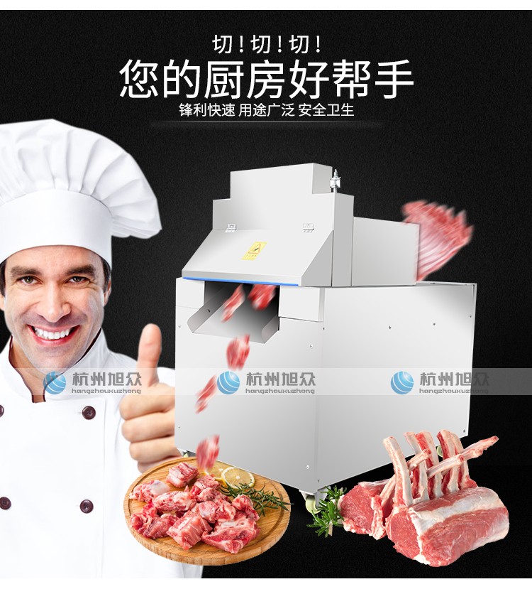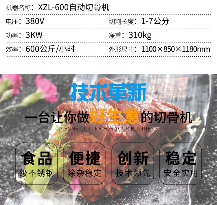 XZL-600自動(dòng)切骨機(jī)適用于小型食品加工廠、屠宰場(chǎng)、肉類加工廠、超市等單位使用。適用于中小型動(dòng)物骨頭,排骨,冷凍肉,凍雞、凍魚、鮮骨頭、鮮肉等加工設(shè)備。切骨機(jī)接觸食品的部位及外觀部位均采用不銹鋼或耐腐蝕材料制造,符合食品衛(wèi)生要求。本機(jī)設(shè)計(jì)合理,清洗方便,無(wú)損耗,采用特殊刀具切骨,不產(chǎn)生碎骨,較大程度保護(hù)了您的利益,且全自動(dòng)送料,操作簡(jiǎn)單,大大的減輕工人勞動(dòng)強(qiáng)度,提高了安全系數(shù)。不易會(huì)傷到手,具有效率高,能耗低,操作安全,外形美觀等特點(diǎn)。