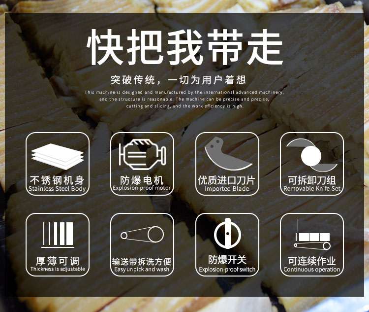 l 特制法國(guó)進(jìn)口刀片,鋒利持久,二把刀片切割原理,能將叉燒肉、臘肉、五花肉、牛肉、鹵味、熟肉類(lèi)以及一些根莖類(lèi)蘿卜,土豆,黃瓜,蓮藕,辣椒,苦瓜,絲瓜,西葫蘆等切成片形狀;