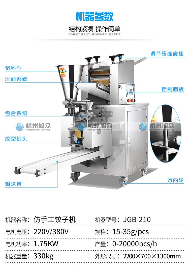 JGB-210型仿手工餃子機,本機采用自動壓面皮包餃子的新工藝技術(shù),本機可生產(chǎn)速凍餃子等,能生產(chǎn)各種肉餡、肉菜混合餡、全菜餡及其他種餡的餃子,適用于餃子館、食品生產(chǎn)廠家、賓館、飯店、餐廳、團體食堂、學(xué)校、部隊。免費上門安裝調(diào)試,贈送面點工藝