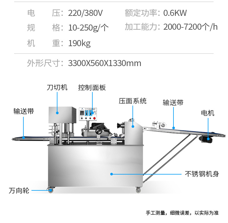 名稱MP800A型刀切饅頭機(jī) 電源220/380V(見(jiàn)機(jī)器銘牌) 功率0.6kw 產(chǎn)量2000-7200個(gè)/h 尺寸3300×560×1330mm 重量190kg 規(guī)格10-250g/個(gè) 其他