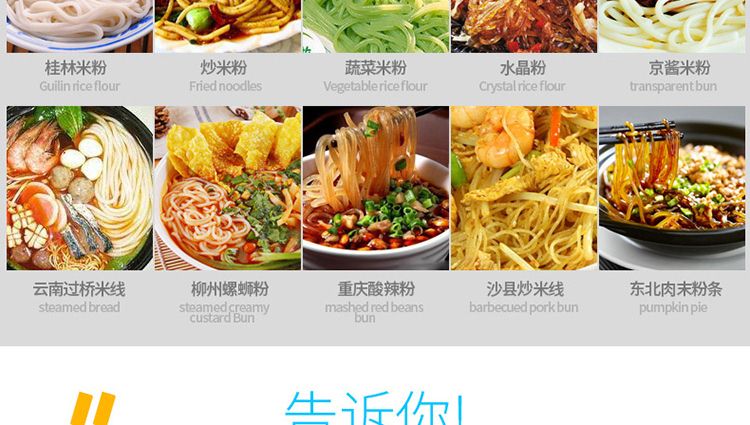 一步成型米粉機(jī),一機(jī)多用:米粉機(jī)廣泛適用于所有含淀粉類糧食作物。大米、玉米、蕎麥、紅薯、土豆、綠豆、豌豆等都可以生產(chǎn),它不僅能生產(chǎn)米粉、米粉、朝鮮冷面、牛筋面、年糕、玉米面條、各種雜糧粉絲、各種面條、雜糧面條、彩色面條等多種面食品