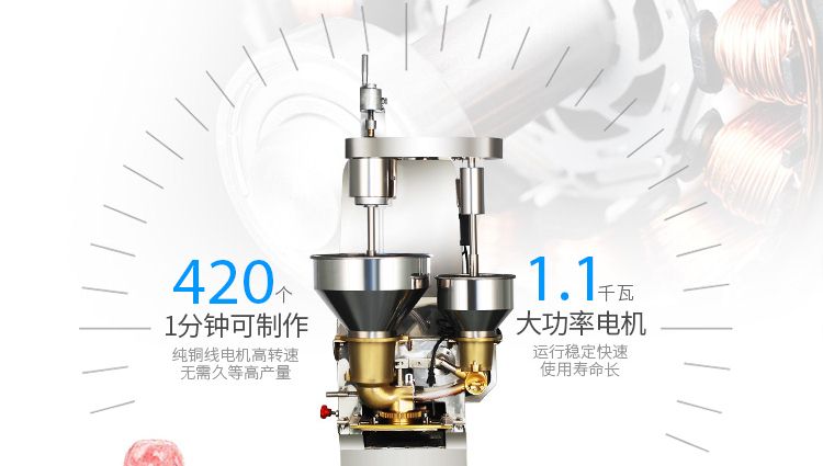 名稱SZ-602包心肉丸機 電源220/380V(見機器銘牌) 功率1.1kw 產(chǎn)量140-420個/分鐘 尺寸770*530*1280mm 重量200kg 規(guī)格 其他