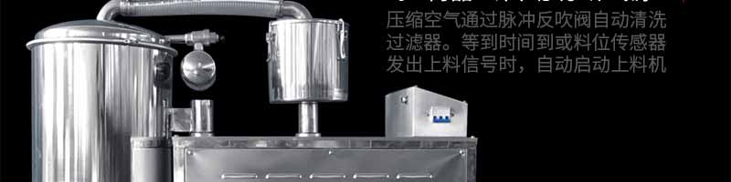 真空上料機(jī)由真空泵(無油、無水)、不銹鋼吸料咀、輸送軟管、PE過濾器(或316L不銹鋼過濾器)、壓縮空氣反吹裝置、氣動(dòng)放料門裝置、真空料斗和料位自動(dòng)控制裝置等組成,整套系統(tǒng)設(shè)計(jì)合理、制造精美。