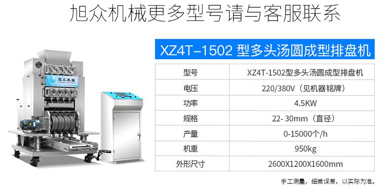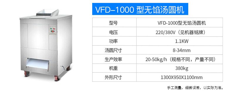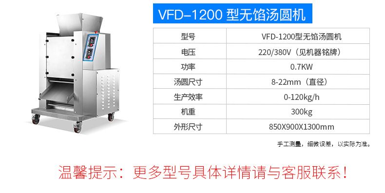 名稱VFD-4000型湯圓自動(dòng)成型排盤一體機(jī) 電源220/380V(見機(jī)器名牌) 功率2.2kw 產(chǎn)量0-4000個(gè)/小時(shí) 尺寸外形尺寸1340*1120*1520mm 重量280kg 規(guī)格8-120克/個(gè) 其他