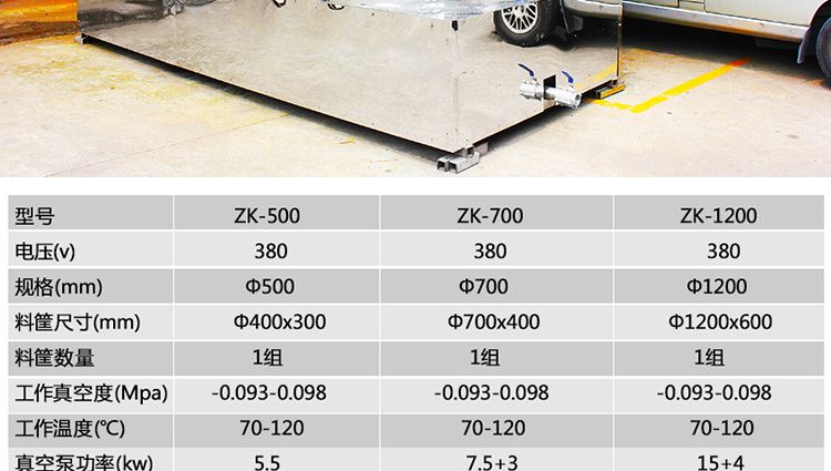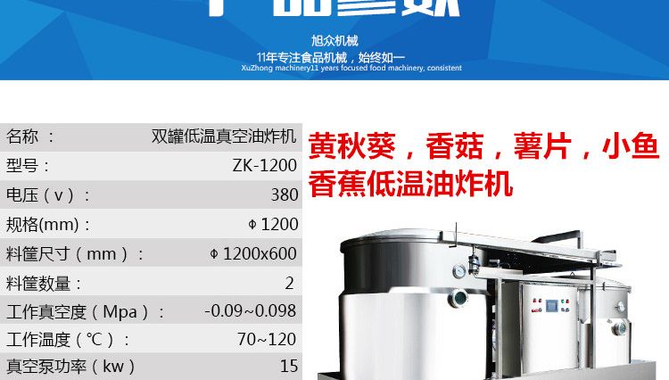 名稱ZK-1200真空油炸機(jī) 電源380V 功率22+7.5kw 產(chǎn)量100-300kg/次 尺寸4700*2500*3000mm 重量 規(guī)格料框數(shù)量1組;加熱方式:導(dǎo)熱油 其他